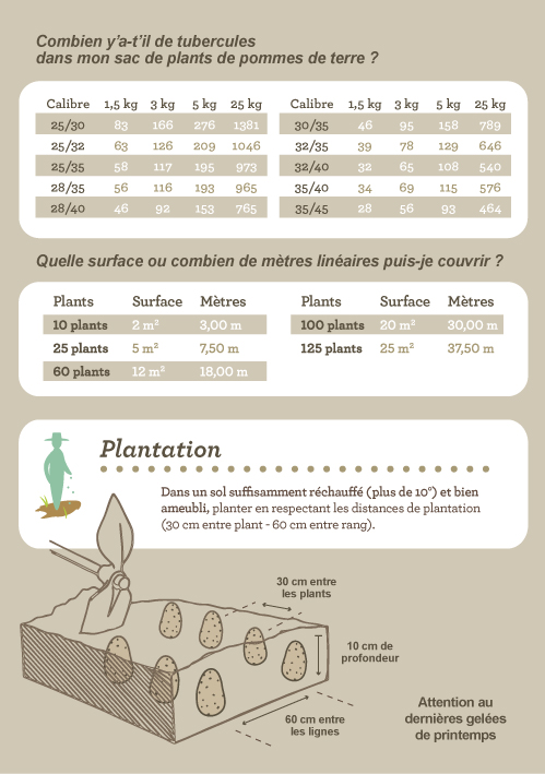 Incidence sur la récolte: un petit calibre aura moins de pommes de terre sous chaque pied, mais elles grossiront plus vite et seront récoltées plus tôt (inversement pour le calibre moyen). Par contre, ayant moins de réserve pour assurer le démarrage de la plante (avant le relais des racines), il sera plus fragile en cas de printemps froid et capricieux.
