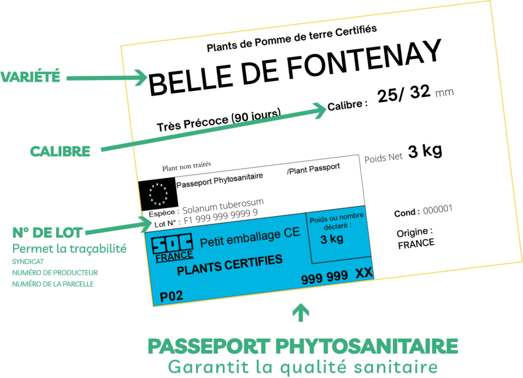 L’étiquette de certification délivrée par la Direction de la qualité et du contrôle officiel (SOC France) est l’attestation officielle du respect du processus de contrôle et de traçabilité. Elle n’est délivrée que si les plants de pomme de terre sont conformes aux règles et normes du règlement technique français, ainsi que du règlement relatif à la santé des végétaux.